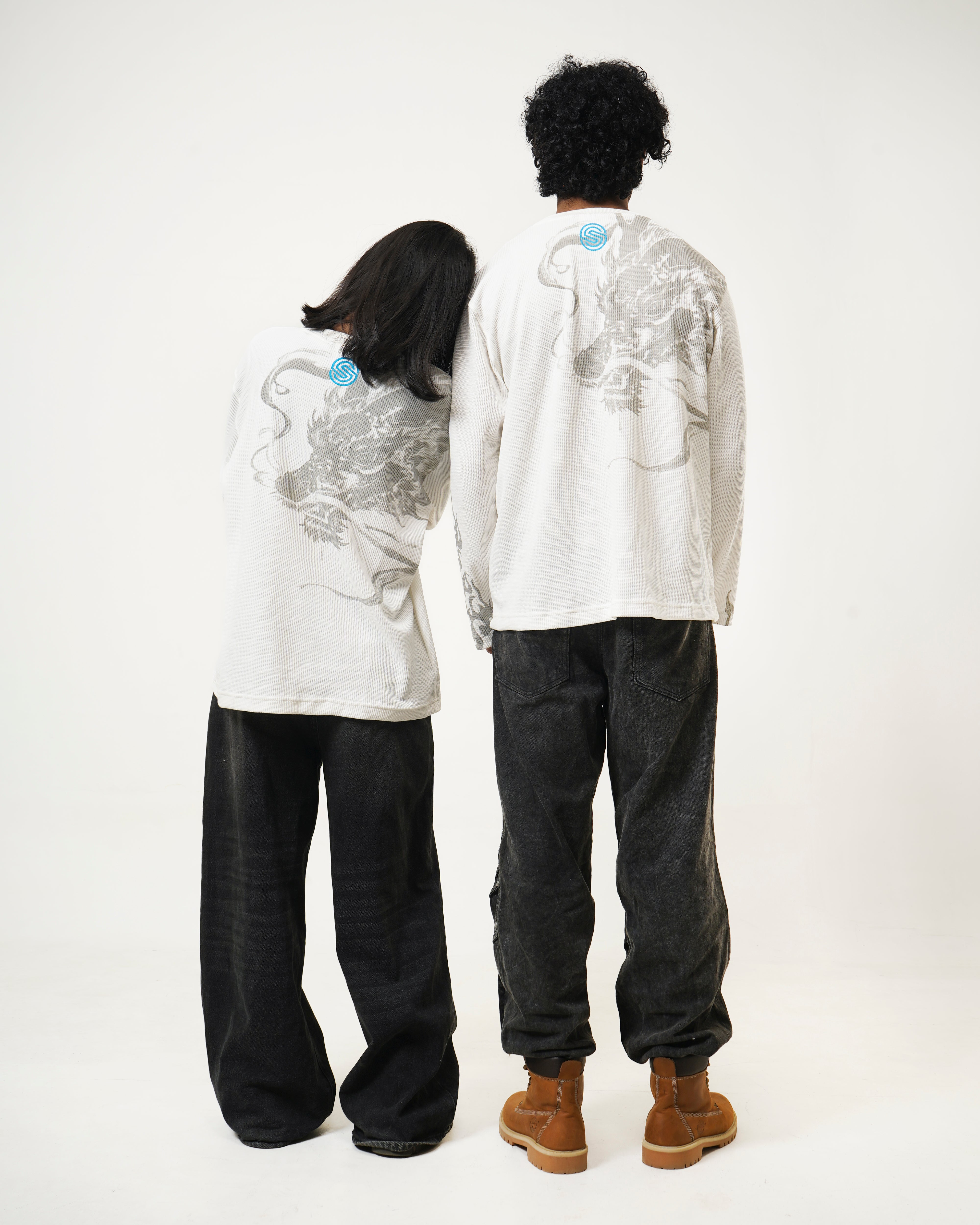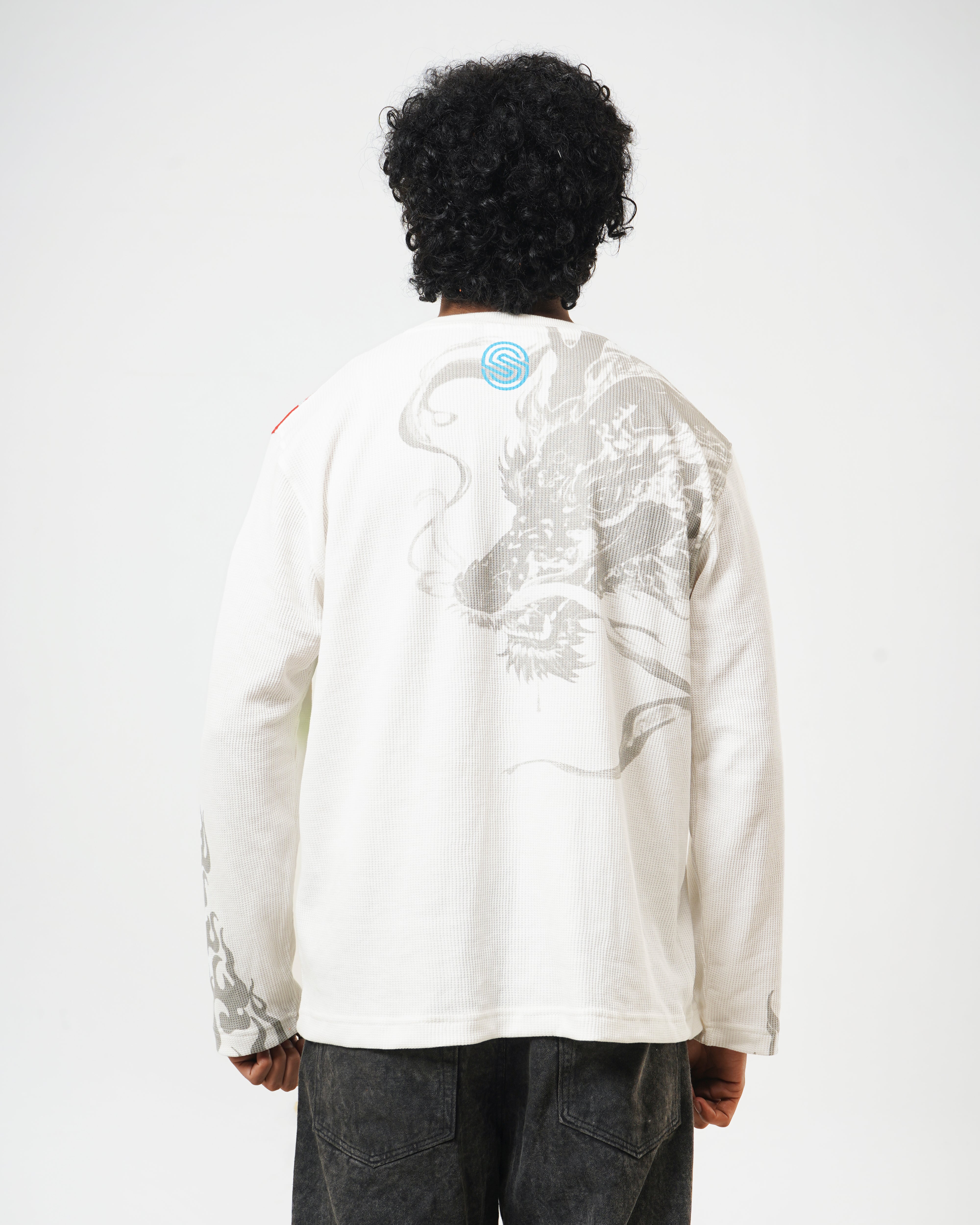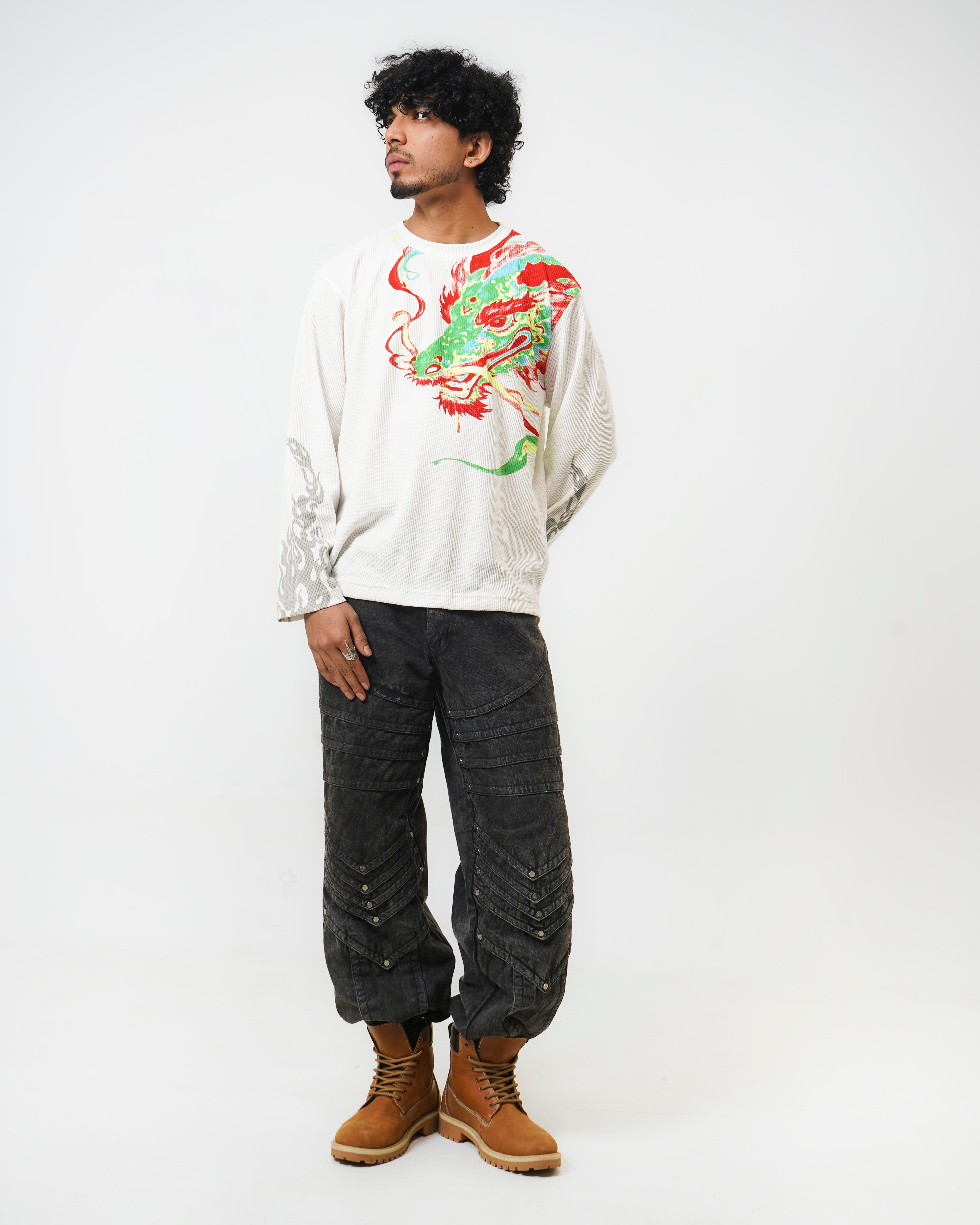 A fusion of high-voltage color and silent shadows. The Arc Fire full-sleeve T-shirt is centered around the prismatic dragon—a symbol of raw energy. Balanced by a monochromatic reverse print and signature flame-detailed sleeves, this piece is designed for those who "Ignite the Calm."
